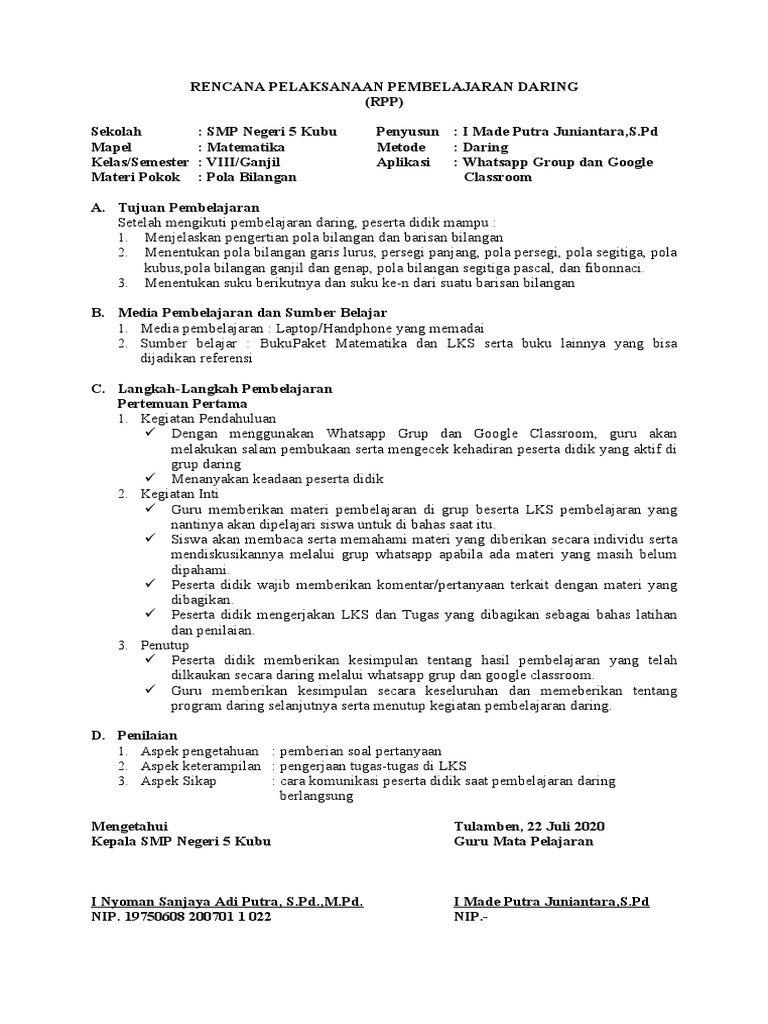 Untuk mendapatkan contoh rpp 1 lembar matematika smp kelas 7, 8 dan 9 silahkan download filenya di bawah ini. Rpp matematika k 13 kelas viii pola bilangan download disini. Selengkapnya silakan sobat download lengkap rpp daring matematika 1 lembar kelas vii terbaru. Arti dari pembelajaran daring adalah pembelajaran yang dilakukan secara online. Strategi penyampaian pembelajaran daring berbeda dengan pembelajaran tatap muka.